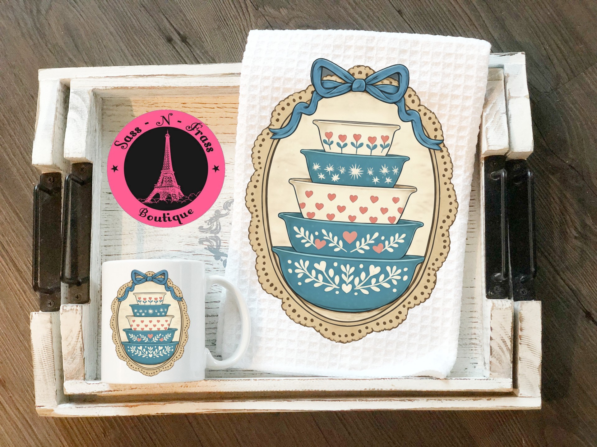 Bring back the 90’s and grandmas bowls! Nostalgia overload! This towel mug set makes every kitchen have a touch of grandmas love in it. You’ll love how it takes you back in time. The towel is very absorbent and the mug is a 12 oz mug great for coffee or tea. Maybe you prefer hot chocolate it can totally handle that for you too! Blue bowls, hearts, and a bow what more could you ask for in the kitchen.