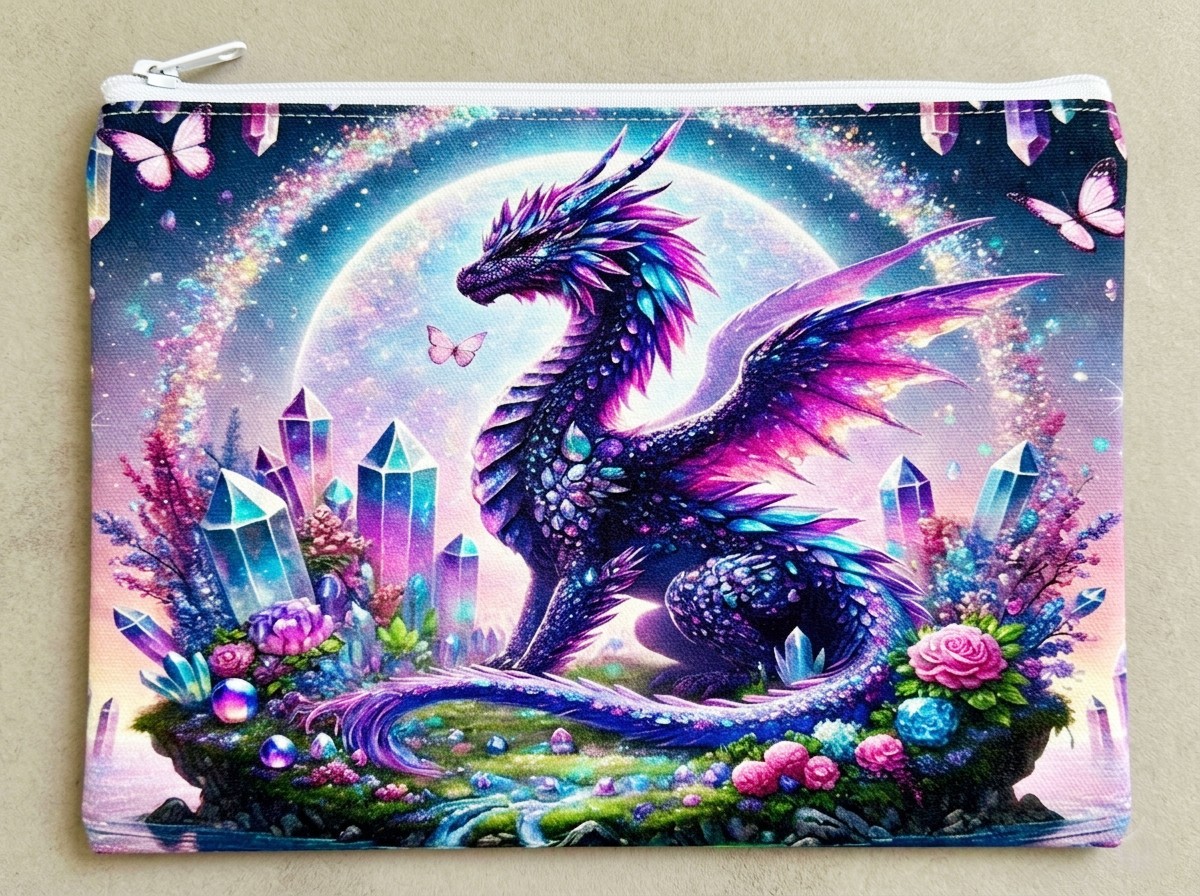 Add a touch of magic to your daily routine with this stunning, high-definition fantasy art pouch. Featuring a majestic purple and teal dragon nestled among glowing crystals and vibrant roses, this bag is a true standout piece for anyone who loves celestial and whimsical aesthetics.