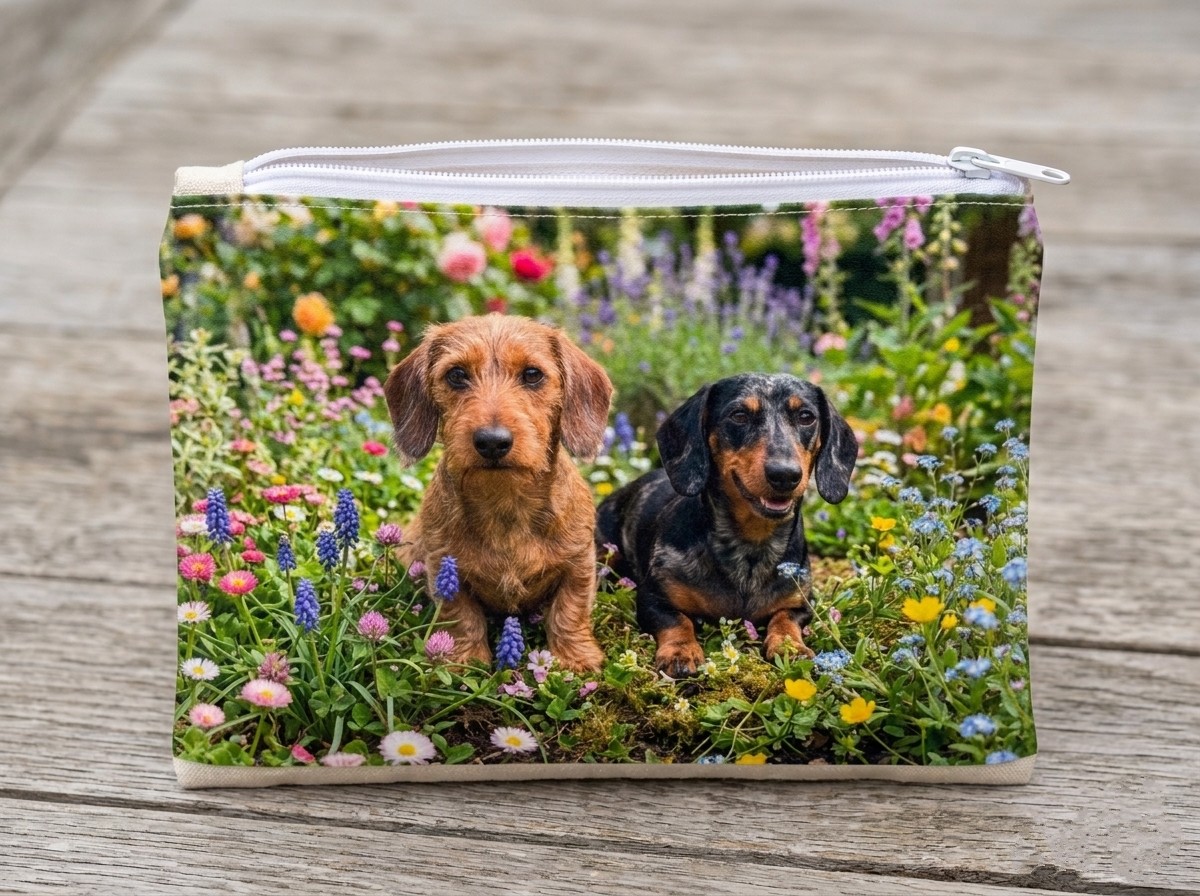 This Dachshund Garden Canvas Pouch is the perfect blend of practical storage and whimsical charm. Featuring two expressive dachshunds—a wire-haired and a dapple—nestled in a vibrant meadow of wildflowers, this high-definition print captures every detail from their soulful eyes to the delicate petals of the surrounding daisies and lupines.