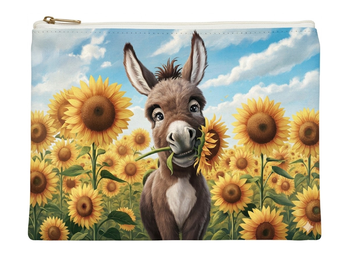 Brighten up your daily routine with our Sunflowers & Smiles Canvas Pouch. Featuring an irresistibly cute, wide-eyed donkey nestled in a vibrant field of golden sunflowers, this bag is a perfect blend of rustic charm and modern functionality.