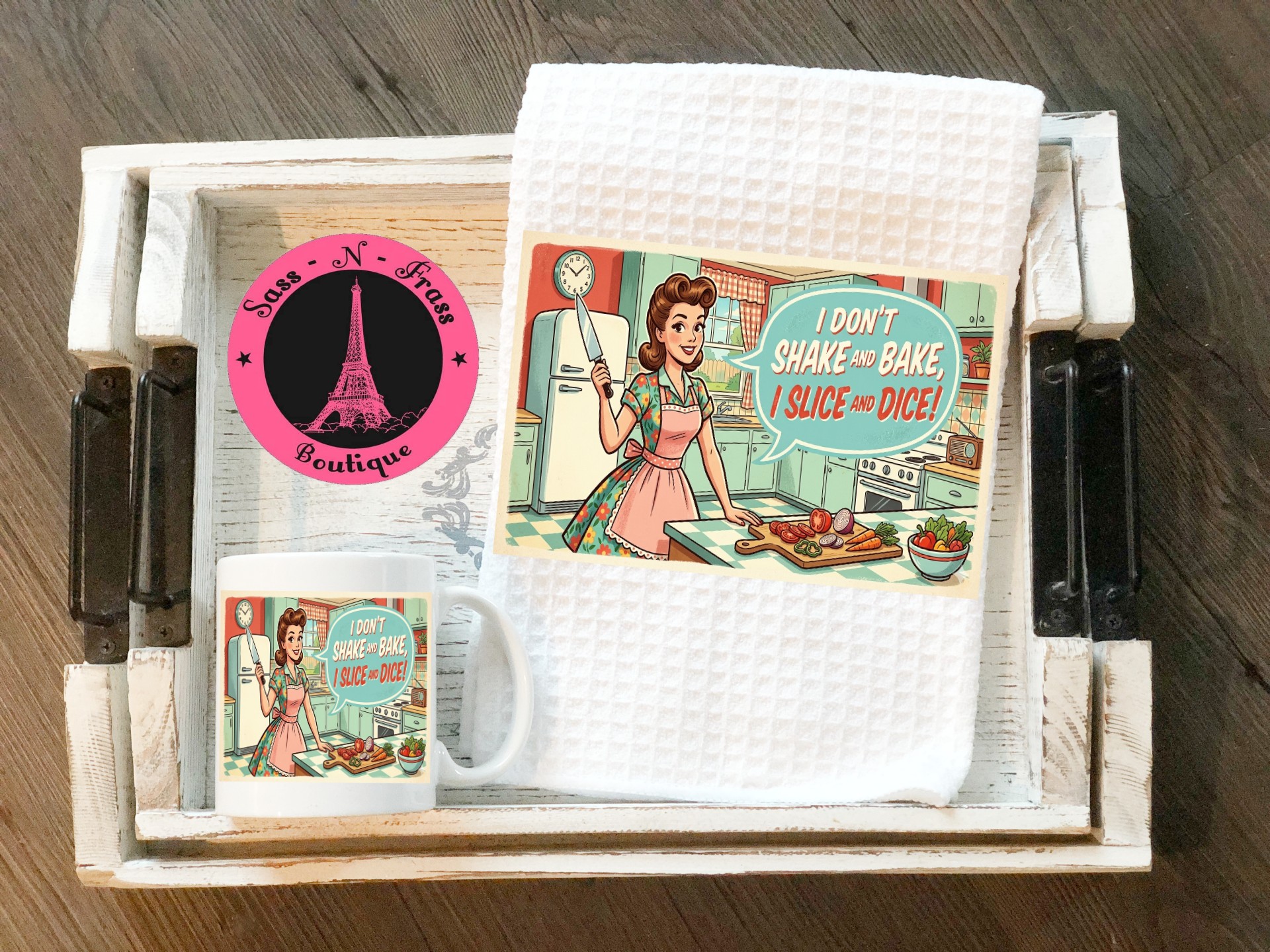 Add some mid-century attitude to the heart of your home with this cheeky and vibrant coordinated set. Featuring a classic 1950s-style illustration and a witty “I Don’t Shake and Bake, I Slice and Dice” slogan, this duo is perfect for the home chef who keeps things sharp and stylish.