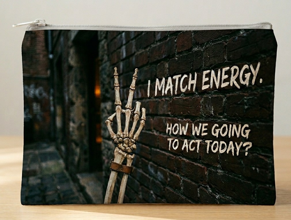 Keep your essentials organized and your boundaries clear. This isn’t just a pouch; it’s a mood. Featuring a bold skeleton hand flashing a peace sign against a gritty, urban brick backdrop, this bag is designed for those who navigate the world with a “what you give is what you get” philosophy.