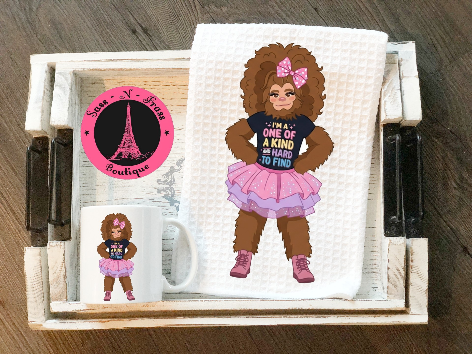 Add a touch of whimsical wonder to your day with this charming illustration of a adorable Sasquatch girl. Dressed in a cozy black t-shirt and a fluffy pink tutu, she proudly wears the playful message “I’M A ONE OF A KIND AND HARD TO FIND.” A cute pink bow with white polka dots completes her look. This unique and heartwarming design is sure to bring a smile to anyone’s face.