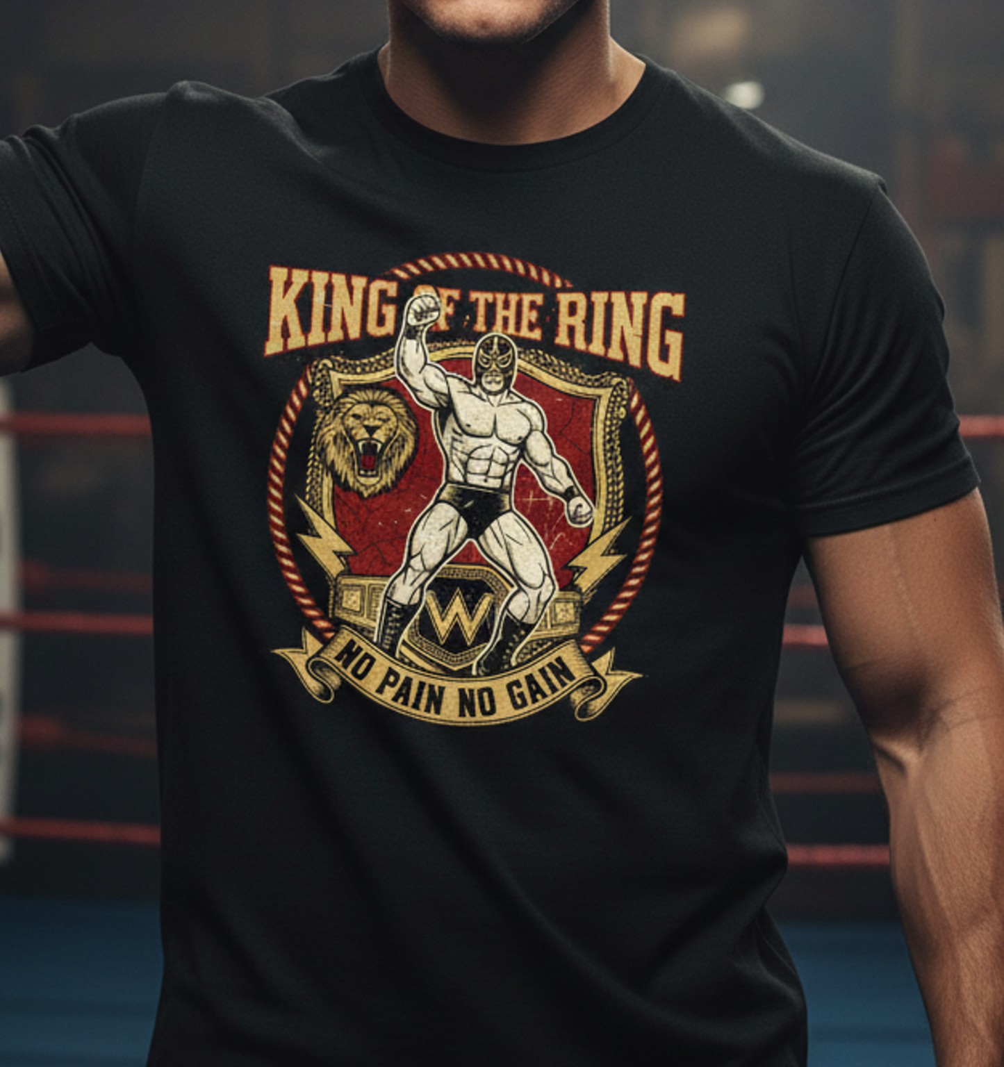 Step into the ring with the “King of the Ring” Vintage Wrestling Tee. This design pays homage to the golden era of wrestling with a high-contrast, distressed graphic featuring a masked luchador, a roaring lion emblem, and the classic “No Pain No Gain” mantra.