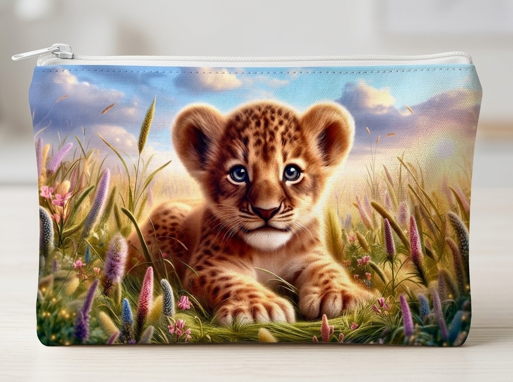 Add a touch of warmth and wonder to your daily essentials with this charming canvas zipper bag. Featuring a stunning, high-definition illustration of a baby lion cub nestled in a sun-drenched wildflower meadow, this pouch combines artistic beauty with everyday functionality.