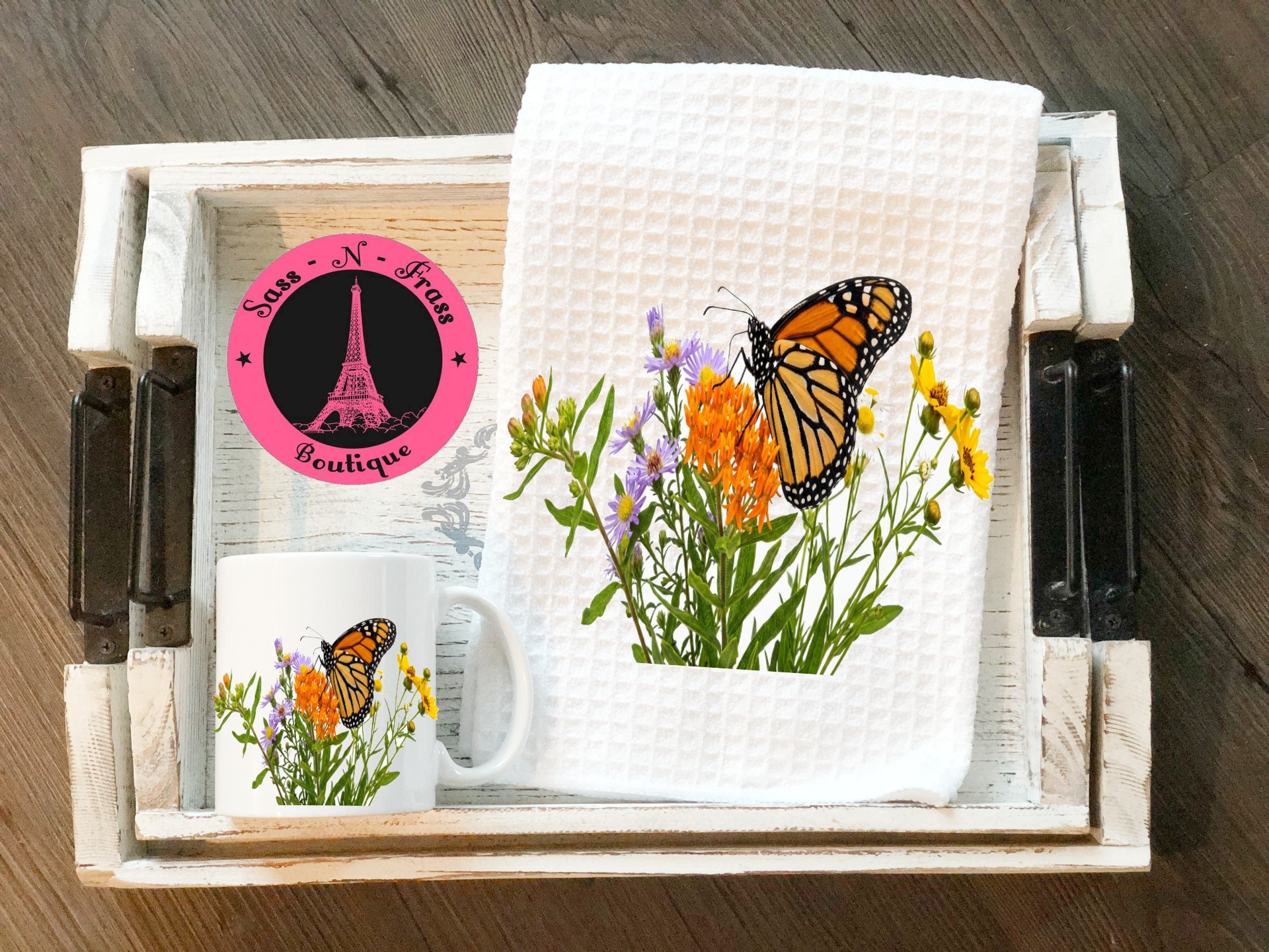 Bring a touch of nature’s elegance into the home with this stunning coordinated set. Featuring a highly detailed Monarch butterfly perched atop a colorful bouquet of wildflowers, this design is printed with high-definition clarity that pops against a crisp white background.