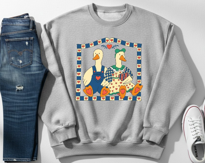 Lean into the ultimate nostalgia with this cute goose couple in their signature 90s outfits—denim overalls and a gingham heart dress. Surrounded by a classic blue and yellow heart border, this design is the perfect “ugly-cute” retro gift for anyone obsessed with 90s kitchen collectibles. Runs true to size and looks adorable with jeans! Stay warm and stay cute with this sweatshirt.