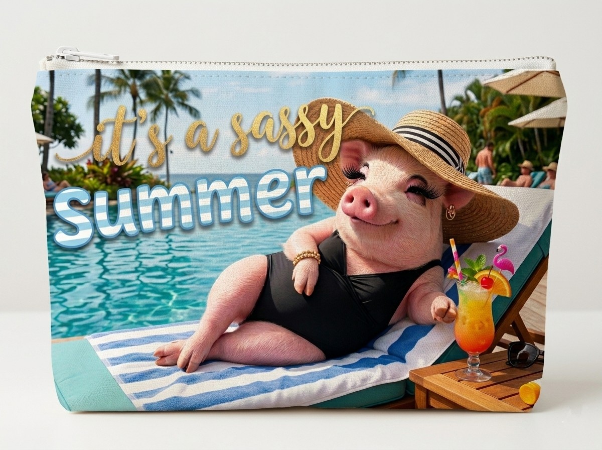 Whether you’re heading to the beach or just organizing your vanity, this vibrant canvas pouch brings the vacation vibes wherever you go. Featuring a glamorously accessorized pig living her absolute best life—complete with sky-high lashes, a chic floppy hat, and a tropical drink—this bag is a reminder that summer is a state of mind (and a little bit of attitude).