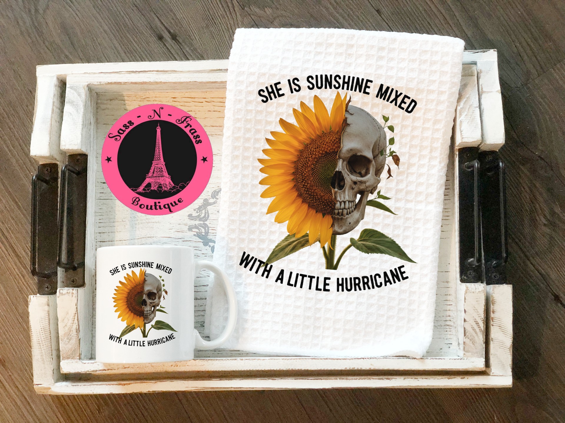 Add a touch of “wildflower soul” to your kitchen or bath. This 16×24 inch waffle weave towel features a striking split-design: half vibrant sunflower, half weathered skull. It’s the perfect tribute to the woman who is all grace until you give her a reason to bring the storm. Highly absorbent, quick-drying, and 100% unapologetic.
