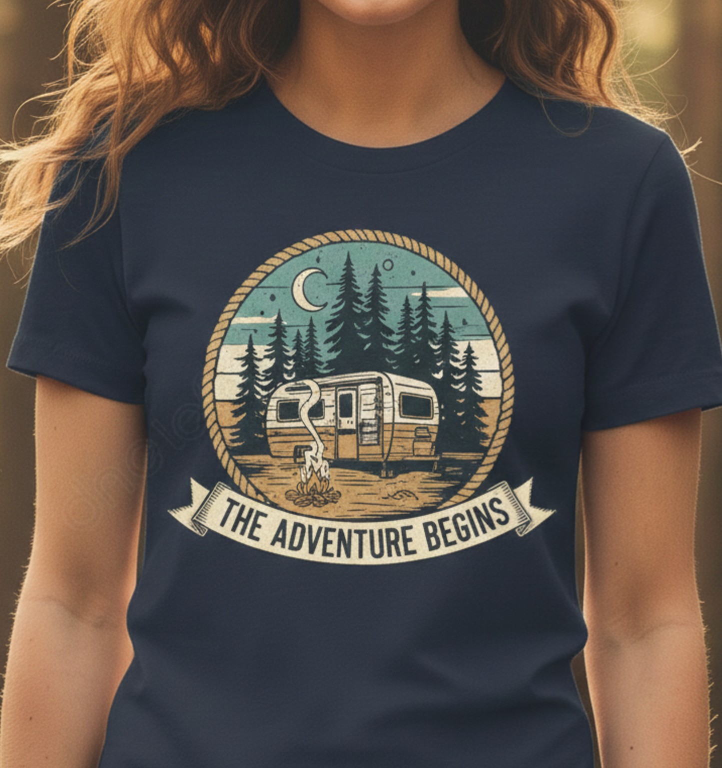 Answer the call of the wild with our “The Adventure Begins” Vintage Camper Tee. Featuring a beautifully detailed retro trailer tucked under a crescent moon and towering pines, this shirt captures the true essence of life on the road. The retro aesthetic, complete with a cozy campfire and a classic rope-border badge, offers a nostalgic nod to the great American road trip.